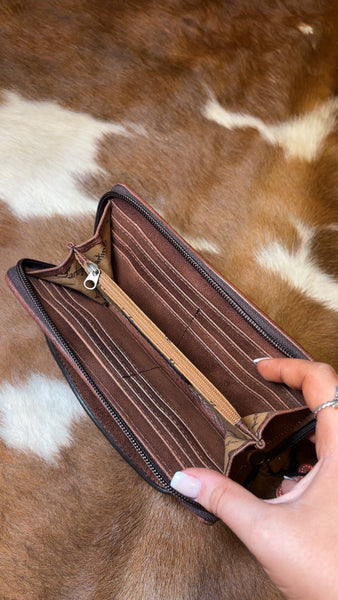 Leather wallet with Zipper Coin Pocket, 12 card holder slots & 2 large slots.  Has zipper closure. Has removable wristlet