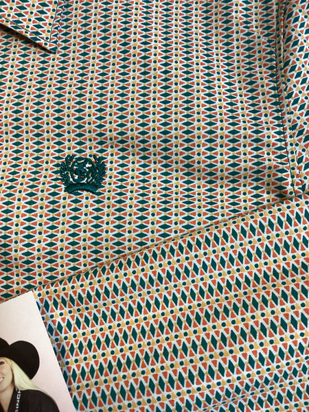 Long sleeve ladies fit button up. Orange, Green and Yellow Pattern. Western shirts